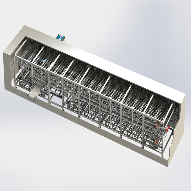 The guide rails moves horizontally,raising or lowering the structure, extending the length of the guide rails to accommodate more dough for fermentation in the proofing room, saving space for production line layout
